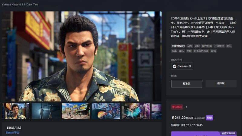 《人中之龙 极3 / 人中之龙3外传 Dark Ties》(Yakuza Kiwami 3 & Dark Ties)即将于 2 月 12 日正式发售,现已登陆杉果商城,领券预购仅需 241.2 元,比 Steam 首发便宜 27 元,感兴趣的朋友可以来杉果入手。