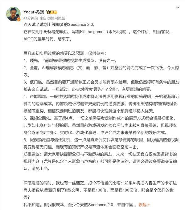 站长之家(ChinaZ.com)2月9日 消息:今日,《黑神话悟空》制作人、游戏科学CEO冯骥针对Seedance2.0模型发表长文,表达了自己的深刻见解。