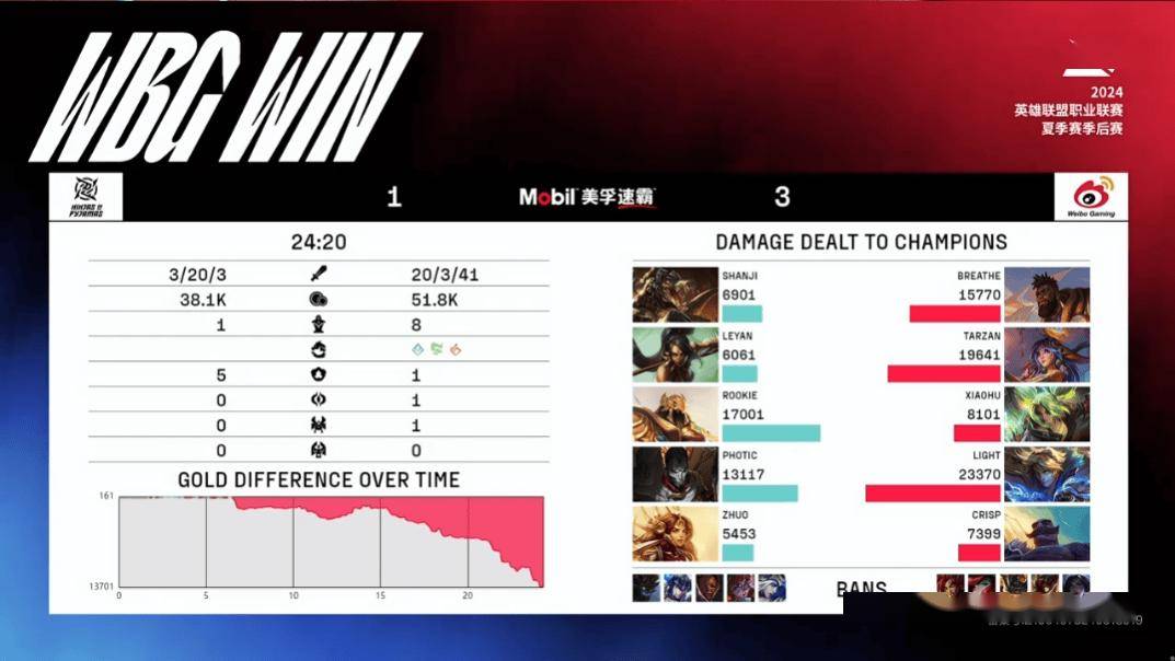 NIP此前几轮比赛的表现让很多人对他们又充满了期待,今天对战WBG也是是否可以拿到双败复活甲资格的关键Bo5。结果最终NIP被WBG以3-1击败,虽然赢了一局,但由于最后一盘过于碾压和人机,导致观感上让人觉得两队的差距很大。最重要的还是WBG自己放弃了前面使用的体系,莫名其妙又捡起了沙皇豹女鳄鱼玩了起来。结果这豹女前期小龙河道入侵失败被吊打0换3,造成了WBG滚雪球一边倒的局面。