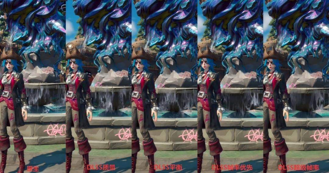 额外对比不同DLSS超分辨率档位下的画质差异,可以看到,得益于游戏本身采用的3D卡通渲染画风,不同超分效果下,除了画面中水体部分的细节略有不同外,整体画面中无论是角色服装的纹理表现还是场景中喷泉底座的材质细节,均没有拉开太大差异。所以如果你的电脑配置一般的话,即便为了获取更高的帧数而使用DLSS超分辨率的“帧率优先”或“超级帧率”模式,其实也并不会对画面表现带来太大的影响,完全可以放心使用。