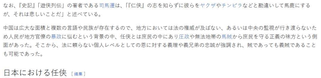 查日语维基:任侠被考据成一种舶自中国的“骑士精神”,轻财重诺、解人之急,不惜生命地去帮助弱者,有战胜强者的自我牺牲品格。尤其在古代法律权威难以覆盖广袤的国土,一些帮助民众的“法外之徒”也可能被视作“正义”。