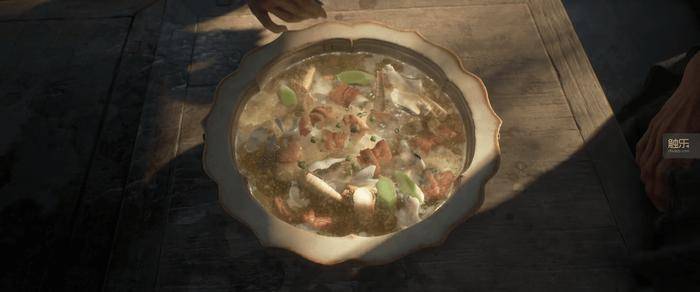 赤鱬、聚肉、仙草,再加上一些特异的调料,主厨是手脚麻利的姑娘,还有三位任劳任怨的帮厨,这个场景可以说是《山海经》版的雨姐了。最后用这些食材熬了一锅珍馐,应了春节的景,“食能知味,寝能安睡”,可以说是一种成年人切合实际的美好祝愿了。