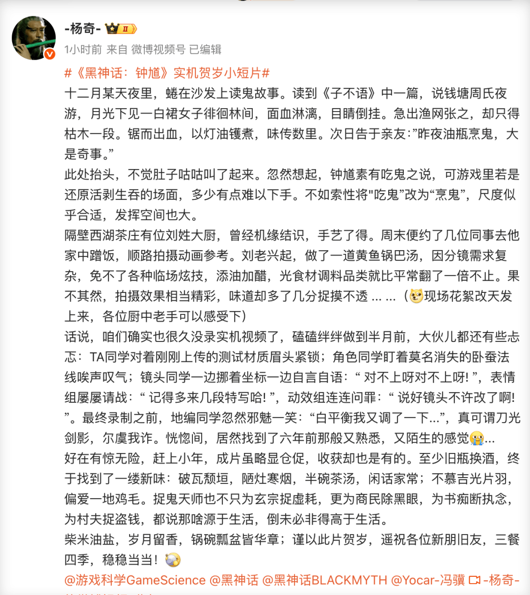 游戏科学联合创始人,《黑神话:悟空》美术总监杨奇则分享了钟馗吃鬼的故事——这应该也是这次贺岁短片背后的设计逻辑。比如实机视频中的那道黄鱼锅巴汤,也是他们去蹭饭时获得的灵感。