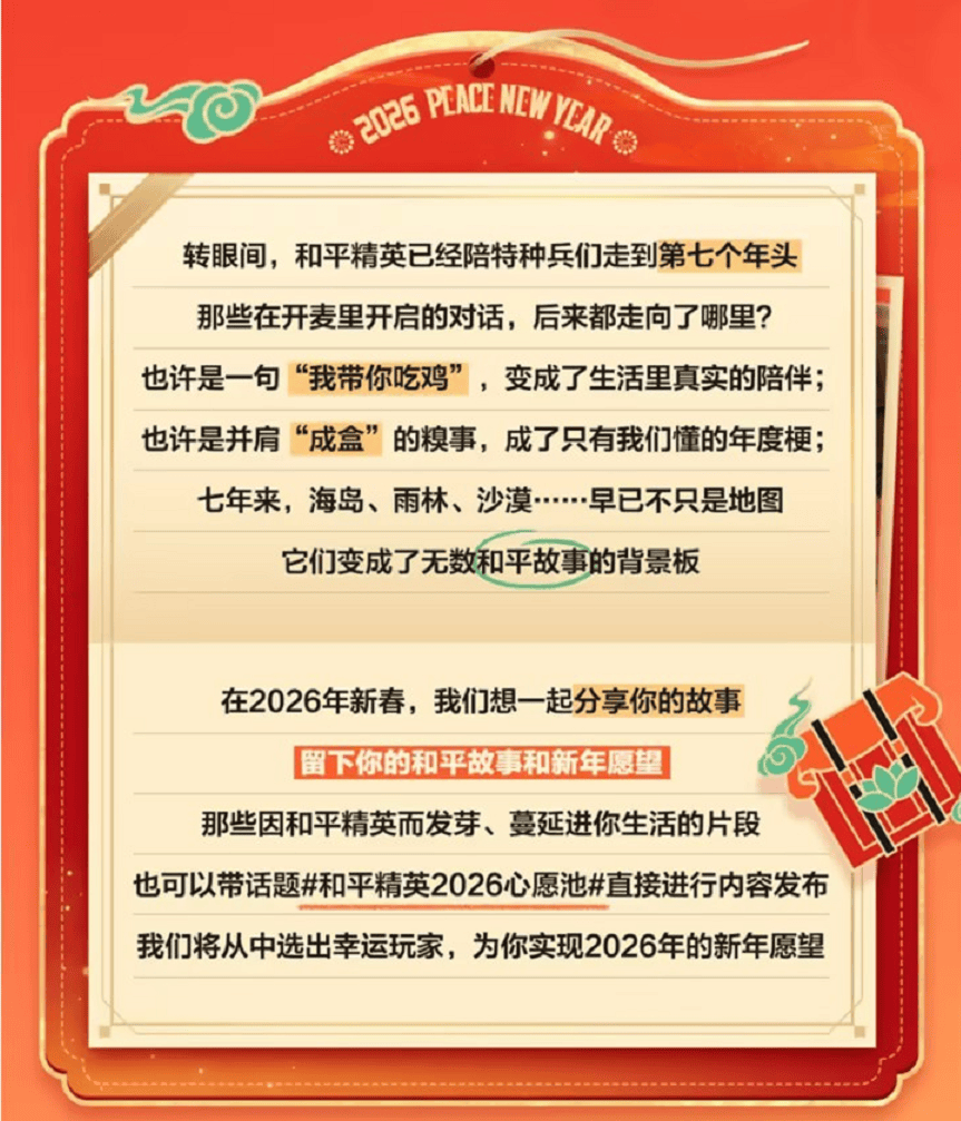 在宏大叙事之外,本次春节活动的精妙一笔,在于最终将话筒交给了玩家。在2026年新春,狂欢的最终落点并非仅是观看,而是邀请每一位玩家成为故事的讲述者与参与者。 通过#和平精英2026心愿池#征集活动,打造一个能承载真实情感、回应个体期待的游戏生态。春节营销已从短期的“事件运营”,升维为长期的“关系经营”。
