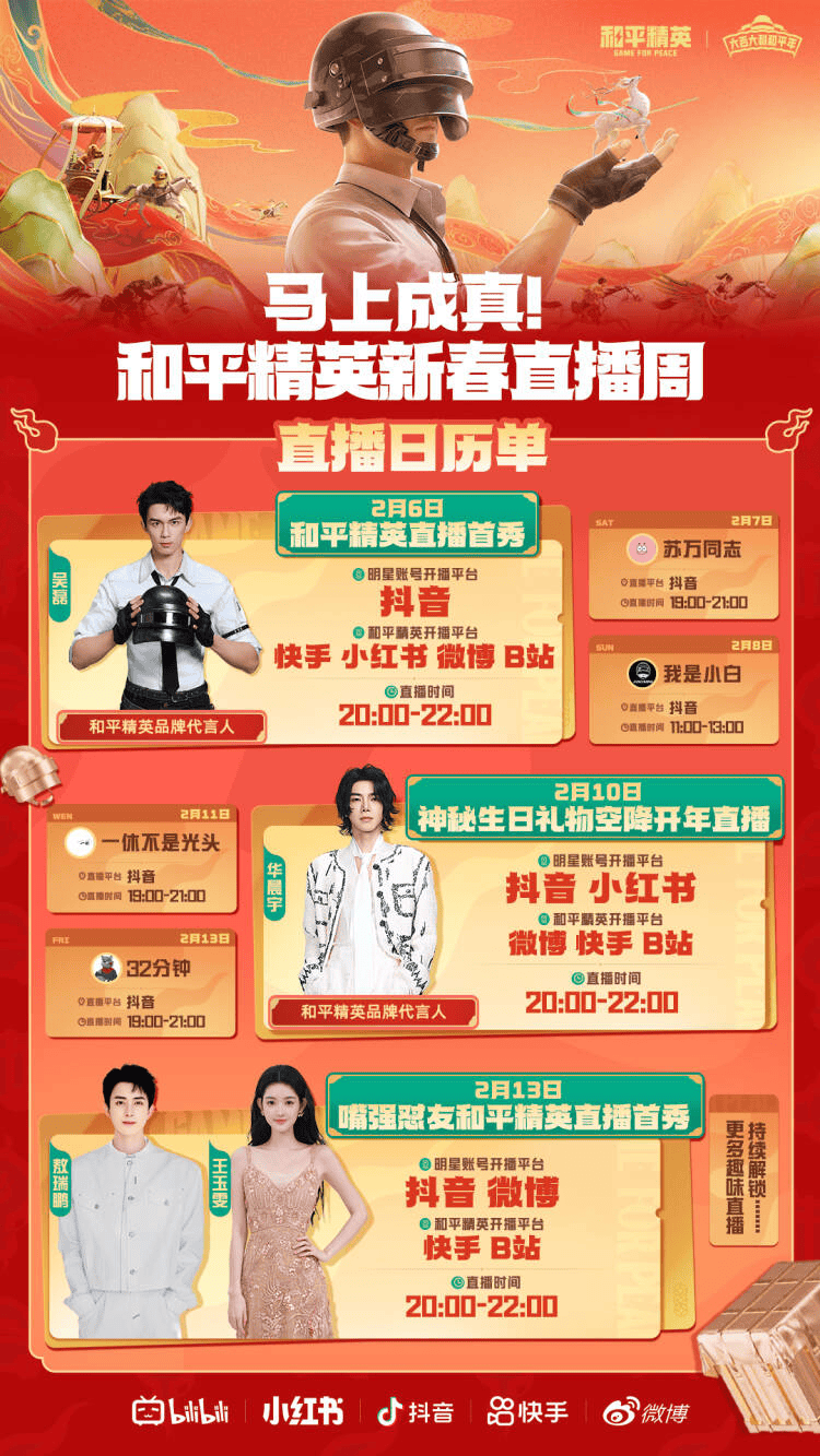2月6日-2月13日,由多位明星达人阵容化身玩家的吃鸡人脉,组成《新春直播周》。本次直播不再是明星单方面露脸,而是实时公布房间号,明星和粉丝真正玩在一起,一起组队跑毒、攻楼、冲刺决赛圈。这还不够,他们还会回应玩家发在弹幕里的游戏愿望,玩家可以决定明星是苟到决赛圈还是现场刚枪。业内都在琢磨怎么把明星直播玩出新花样,《和平精英》这次直播给出了答案:让明星成为玩家的“吃鸡人脉”,游戏心愿,马上成真。