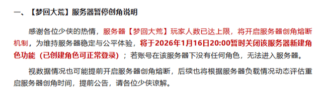 其中,一区“梦回大荒”成为了绝对的焦点,排队人数快速突破五千大关,服务器压力骤增。为了防止被这汹涌的人流冲垮,保障已进入玩家的体验,官方甚至紧急启动了“熔断机制”,暂时关闭了这个服务器的新建角色功能,这“幸福的烦恼”,也从侧面印证游戏当前炙手可热的程度。