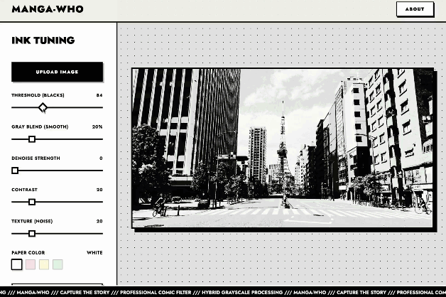 7. “漫画风格加工”免费在线工具 MANGA-WHO,简单操作即可将导入的图片转换为漫画画风,还可以调整明暗,添加纹理,改变底色等,以便快捷地制作背景素材。