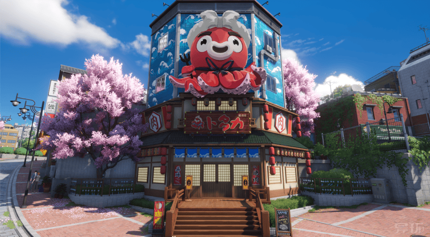 游戏里不少场景和功能性建筑互为表里。譬如,这个造型颇具特点的居酒屋,实际上是可以进入的,玩家在里面能买到各种食物。