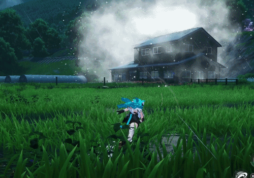 再比如,在一片绿地中被雪花和雾气环绕的房屋: