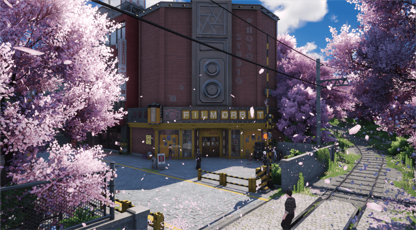 除了“写实”之外,那些充满幻想元素的“写意”场景在海特洛市同样存在,且十分抓人眼球。你能看到列车在海面上行驶,也能看到车站里樱花缓缓飘落,粉色花瓣铺在了月台和铁轨上。