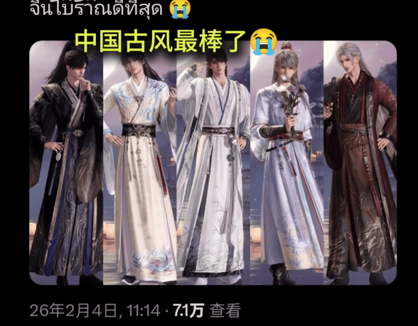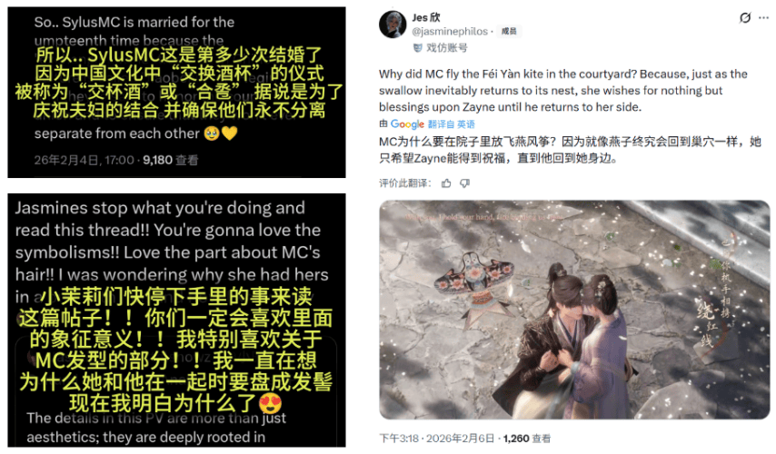 类似的景象,在海外社区里持续上演:有人理解了“发髻”背后的深层身份,为少年夫妻的暗示发出土拨鼠尖叫;有人科普箜篌的历史、解读合卺酒的含义;更有人开始研究不同朝代服饰的形制区别,试图从角色的着装判断其性格与背景……