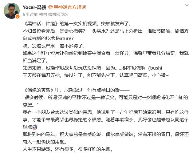 而杨奇也发文,分享了游戏科学这则视频背后的制作思路和过程,感慨还好“赶上小年”。