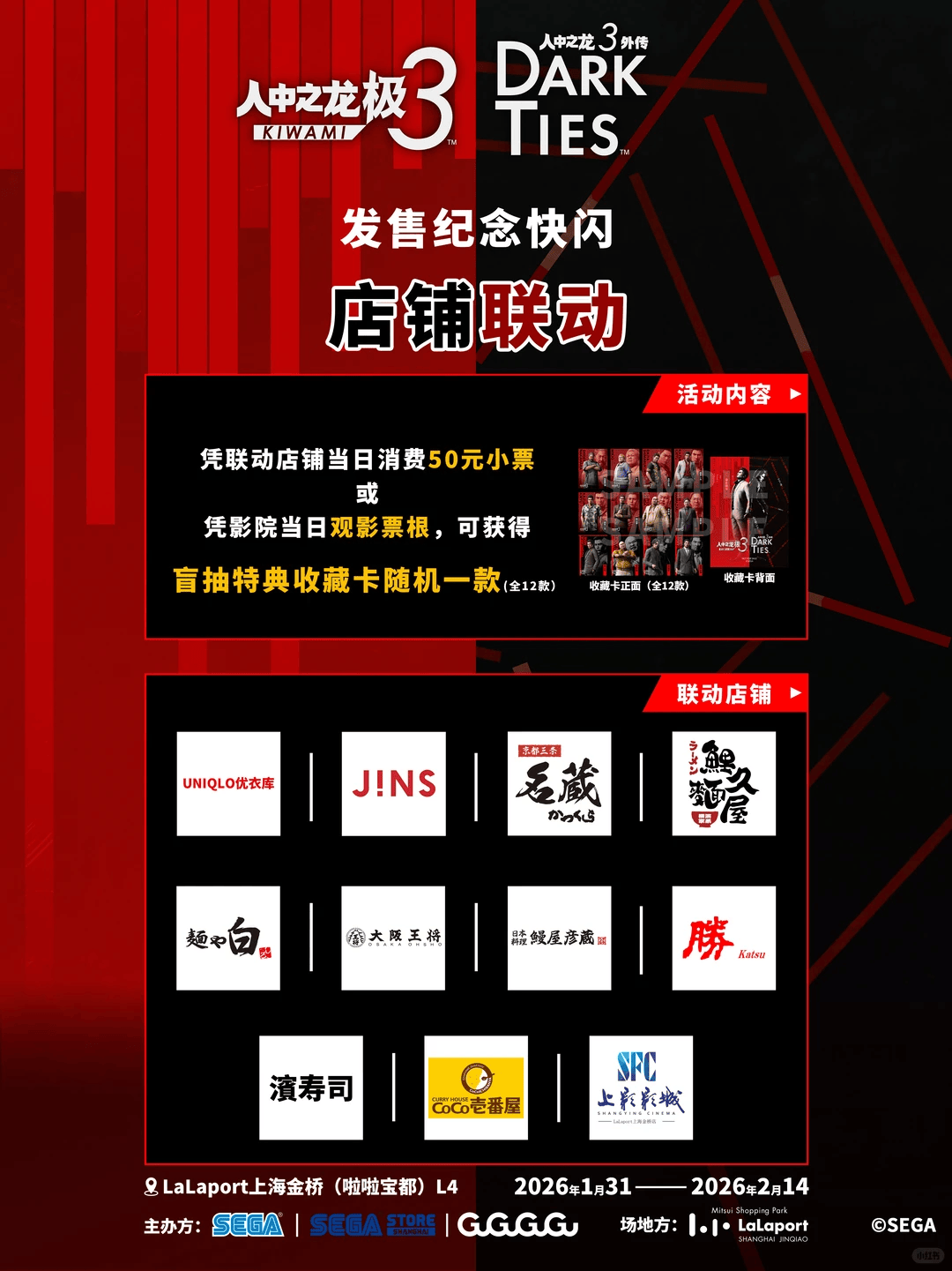 除此之外,快闪店还与拉拉宝都内部的大量店铺达成了合作。在这些店铺消费达到50元以上,或在SFC上影影城进行观影,就可以凭借票据获得盲抽特典收藏卡一张——在新春长假即将来临之际,如果日程上有所空闲,那么来到拉拉宝都体验一下食、游、乐全方位覆盖的“人中之龙主题日”,也是一个不错的选择。