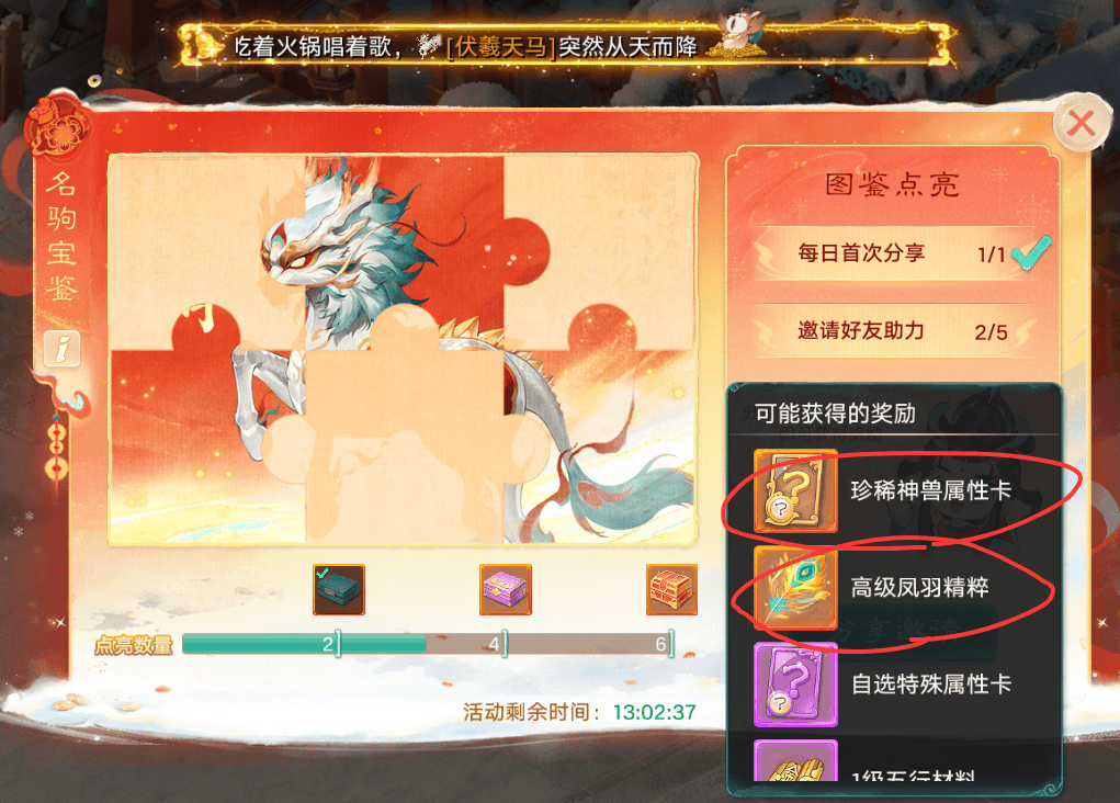 达到6次,可能获得的奖励,包括了珍稀神兽属性卡,以及高级凤羽精粹等,还挺不错的,动动发财的小手点一点就能完成了。任务完成的秘诀就是要早点发出来,因为每个人每天只有5次助力机会呢!