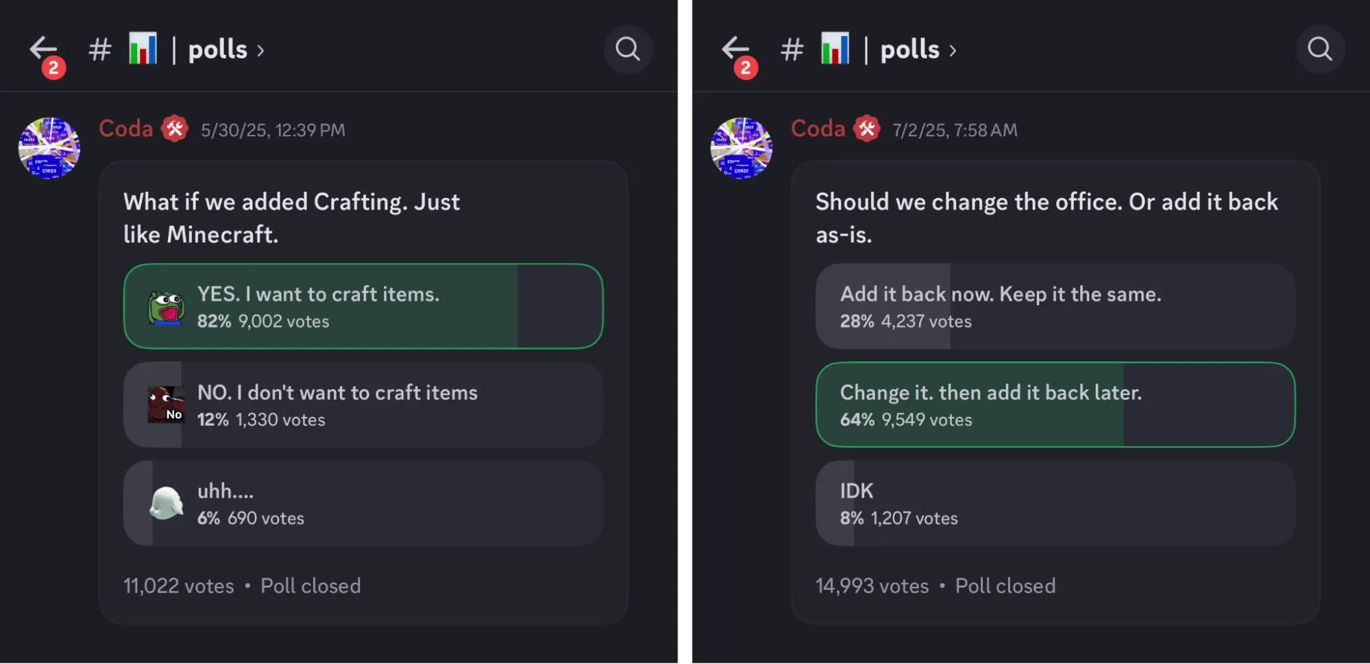 在Discord上,该工作室和玩家建立了开放沟通渠道,包括:收集实时反馈、定期社区投票以及举办粉丝创意比赛(如视频/艺术作品大赛)。这样一来,社区内的玩家变成了“与游戏共同成长的创作者”。