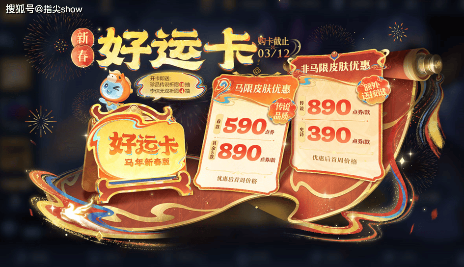 好运卡购买皮肤有折扣,从2月14日花木兰皮肤开始,包含马限皮肤一共11款皮肤,同时也包含奇幻商店底价折扣,获赠无双祈愿和珍品传说祈愿抽奖券等奖励。