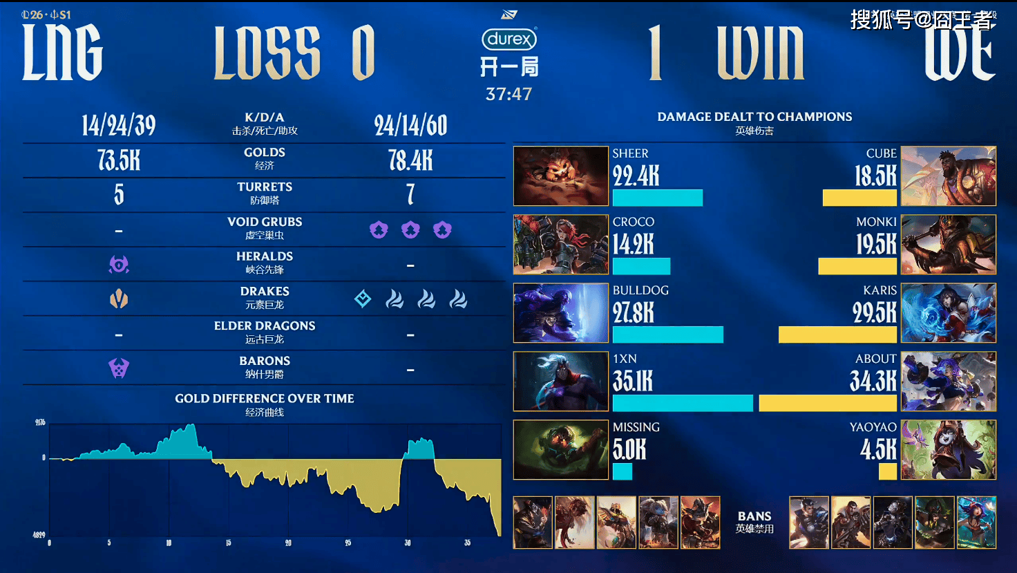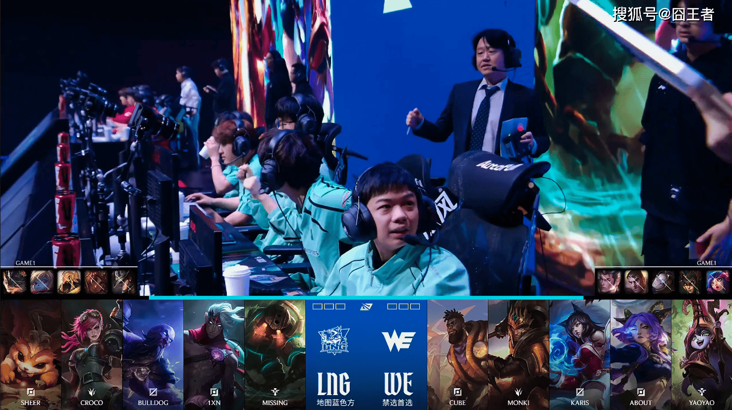 第一局比赛,LNG蓝色方,禁用:兰博,波比,沙皇,岩雀,卡牌,选用:Sheer纳尔,Croco蔚,BullDog瑞兹,1xn韦鲁斯,Missing泰坦;WE红色方,禁用:妮蔻,蛇女,发条,杰斯,赵信,选用:Cube奎桑提,Monki皇子,Karis阿狸,About芸阿娜,yaoyao璐璐