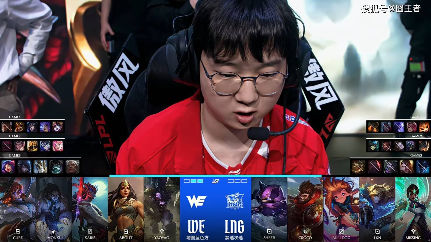 第三局比赛,WE蓝色方,禁用:妮蔻,厄斐琉斯,加里奥,掘墓,狼母,选用:Cube阿萝拉,Monki塞拉斯,Karis永恩,About希维尔,yaoyao牛头;LNG红色方,禁用:梦魇,杰斯,蒙多,塞恩,鳄鱼,选用:Sheer凯南,Croco猴子,BullDog佐伊,1xnEZ,Missing卡尔玛