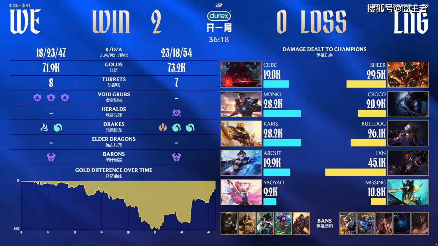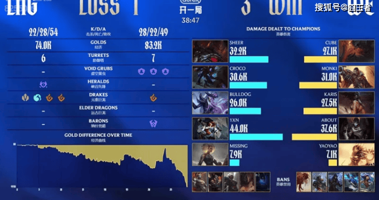 结果第一局比赛,双方从头打到尾,经济几度反转,由WE笑到了最后。3分钟左右:双方蓝区爆发混战,蔚击杀皇子后自家泰坦也被击杀打出一换一;6分钟左右:阿狸游走上路抓死纳尔随后魅惑进塔强杀皇子的蔚拿到人头;9分钟左右:LNG四包二击杀对方双人组后又收掉想要进野区的皇子打出一换三;18分钟左右:Cube奎桑提上路塔下强杀Karis瑞兹;28分钟左右:WE进攻和中路打出二换三;最终37分47秒:泰坦中路开团但是和打野脱节被秒掉,WE击杀对方四人一波结束比赛