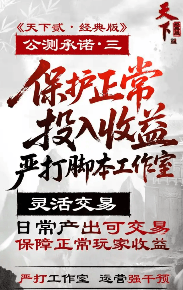 当然《天下贰经典版》也不是光有情怀、有收益,还非常注重玩家的游戏体验。不像一些搬砖游戏里脚本满天飞,《天下贰经典版》的游戏环境对真实的搬砖玩家来说十分友好。因为官方直接重拳出击,严打脚本工作室,避免出现资源烂大街的情况,宠粉保障玩家收益,让玩家赚得爽。