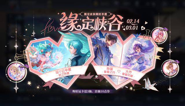 大乔&孙策星传说将在2月14日上架,参与返场祈愿抽奖获得,好运卡赠送3抽,同时挚爱花嫁、挚爱之约、时之祈愿、时之愿境返场。