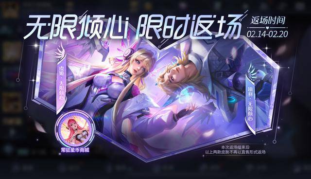 虞姬&项羽的无限倾心将在2月14日返场,单款价格为1430点券。挚爱之约、挚爱花嫁、时之祈愿、时之祈愿将在2月14日抽奖返场,以及对应的星传说可用活动积分兑换。