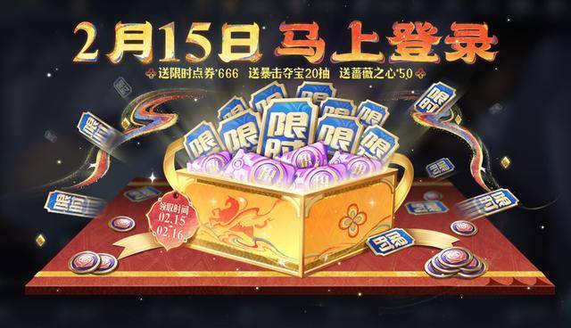 在2月15日登录可领666限时点券+50个蔷薇之心+20张暴击夺宝券+10万小马钱,其中暴击夺宝券可以等暴击夺宝结束转化为积分夺宝券。