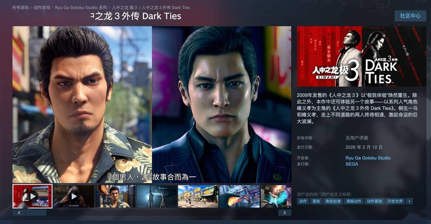 IT之家 2 月 11 日消息,世嘉旗下《人中之龙 极 3 /外传 Dark Ties(Yakuza Kiwami 3 & Dark Ties)》将于明天发售,登陆 PlayStation 5、Xbox Series X|S、任天堂 Switch 2、以及 PC 平台。IT之家附 Steam 商品页(https://store.steampowered.com/app/3937550/_3__3_Dark_Ties/)。