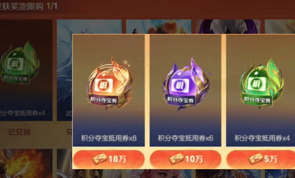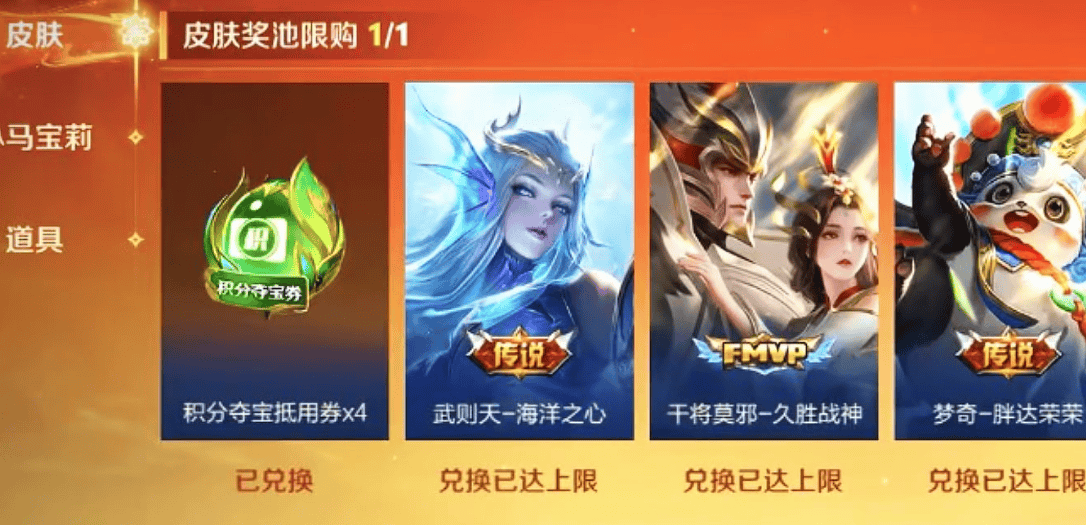 接着,小手一点,积分夺宝券到手,然后再仔细一看,扎心了,其他的所有东西,直接显示兑换已达上限。其他任何皮肤是完全不用想了,去搞道具和灵宝吧,真的是浪费了一个传说皮肤的白嫖机会啊,18万小马钱没有用武之地了。一定要记住,这里面是限购的,只能拿一个,包含积分夺宝券。