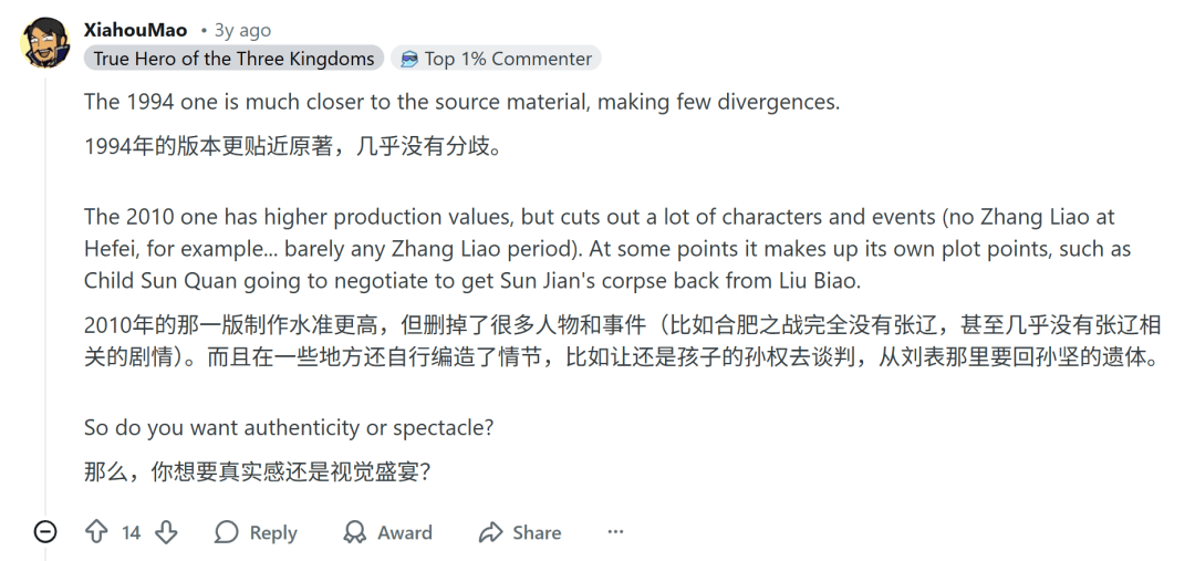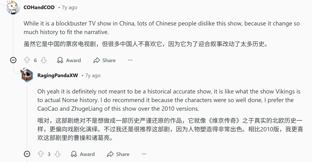 很多海外观众其实都明白新《三国》的缺点,每当有新观众试图入坑,就会有老观众提到那些老生常谈的话题:删减某些角色的戏份,为了迎合叙事改动历史等等。