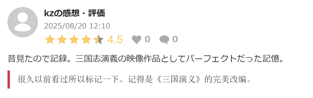 在日本评分网站Filmarks上,新《三国》确实斩获了4.4分(字幕:满分5分)的高分。日本网友毫不吝惜赞美之词,你甚至都找不到一条低于3分的差评。大部分普通观众基本都表示,这恐怕就是最好的三国题材作品了。