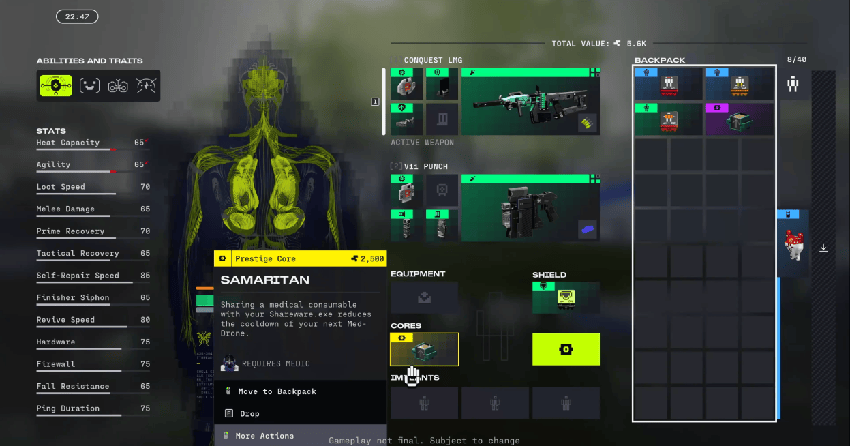 在《马拉松》,你能搜刮到的很大一部分高级战利品,就是含有词条的装备。包括“植入物”与“核心”栏位的装备都有词条,就连枪械也能安装带词条的配件。同时,玩家在游戏中扮演“疾行者”,操纵一具死亡后自动上传记忆的外壳,不同型号的外壳拥有不同的技能,要跟装备词条搭配, 形成用途各异的构筑