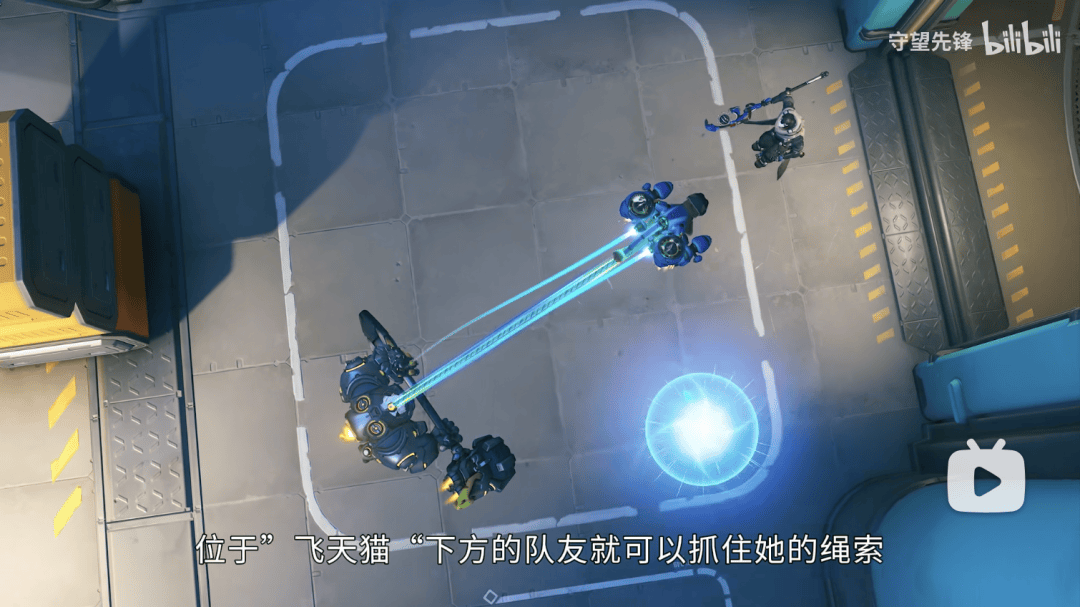它的核心技能「生命绳」可以带队友穿梭于激烈的战场。而且,它在带队友时飞行不会减速,这一点在设计时是刻意安排的。团队表示,「如果带队友会减速,大家可能就不想用这个技能了,体验会很别扭。我们想让飞天猫的核心玩法是灵活支援,所以尽量减少使用障碍。」