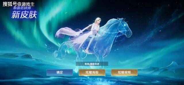 以上是展现动画,在响起经典的背景音乐《Let it go》后,甄姬化身为的艾莎,将会勇敢的策马驰骋,唤醒那颗无拘的心,模型也高度还原了动画里的形象,包括金发+白裙+冰晶马。