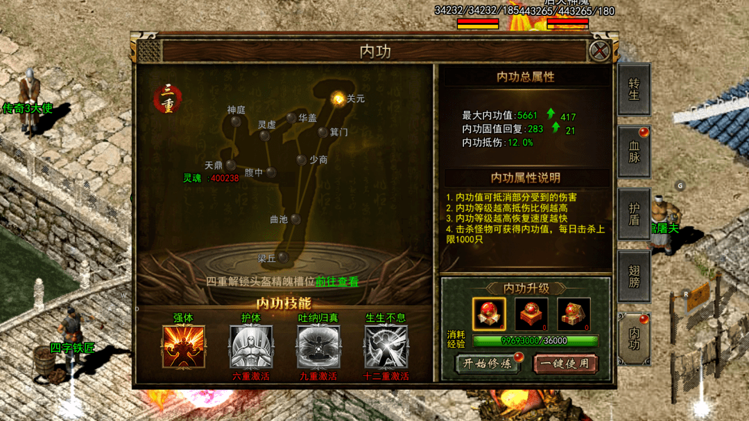 「内功系统」在开服60天后正式开启。开启之后,玩家们将能够获得内功值。根据内功值和内功减伤效果,玩家们能够抵扣一部分受到的伤害。而且随着内功等级的提升,抵伤比例也会增加,恢复速度也会变得更快。玩家们可以通过击杀怪物来获得内功值,每天的击杀上限为1000只。
