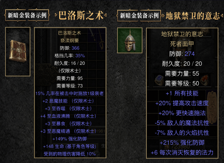术士暗金副手“巴洛斯之书”,以及同时加物理和法系攻速,并带减抗的暗金头“地狱禁卫的意志”。
