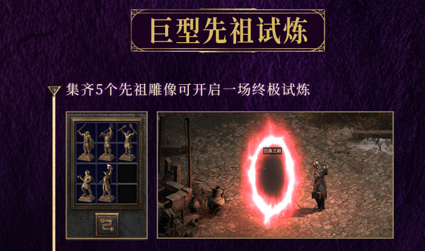 新增“巨型先祖”玩法,恐怖地带会刷新特定Boss,掉落“先祖雕像”,搜集5个雕像可以开启新的隐藏关“终极试炼”,挑战野蛮人,难度较高,掉落全新暗金珠宝。