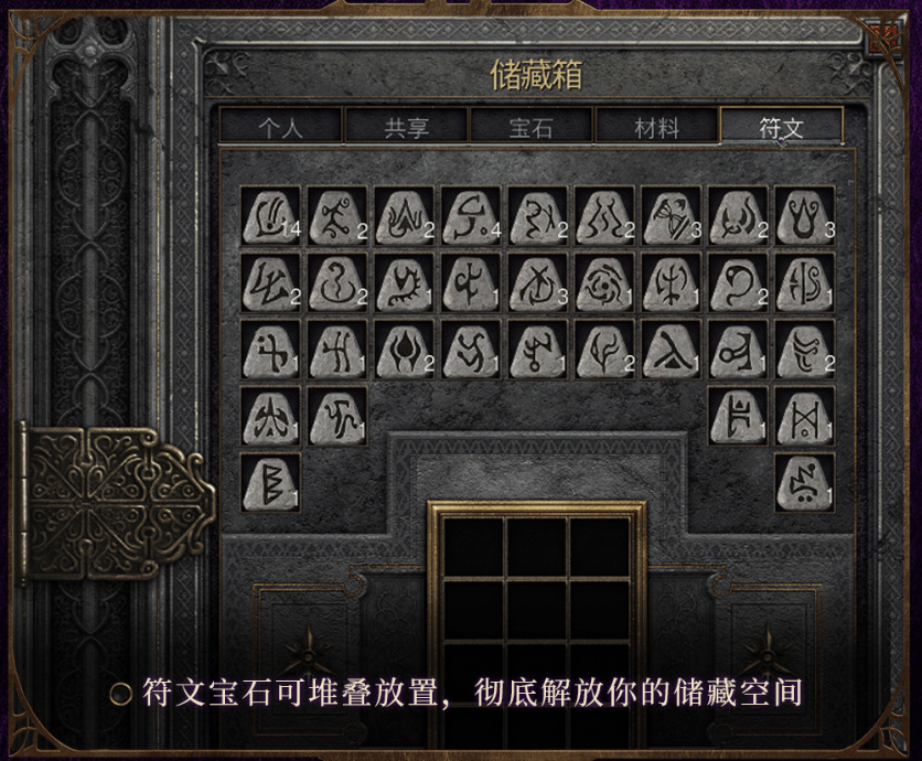 千呼万唤始出来,仓库页面终于增加,符文、宝石等材料可堆叠放置了,极大节省空间。