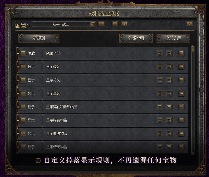 暗黑2迎来原生的装备过滤器,不用再打Mod。玩家根据设定不同规则,选择想要显示的掉落装备。