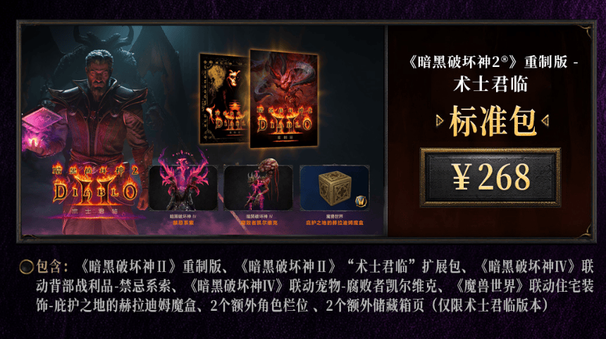 注:新资料片已上架和实装,体验新内容需购买资料片,目前国服单独购买为168元,整合购买基础版为268元(包含基础游戏、毁灭之王、术士君临)。购买之后,彻底区分原版和新DLC,游玩新内容需手动将原角色转至新版本。资料片目前只有非赛模式,预计在几周之后开新赛季。