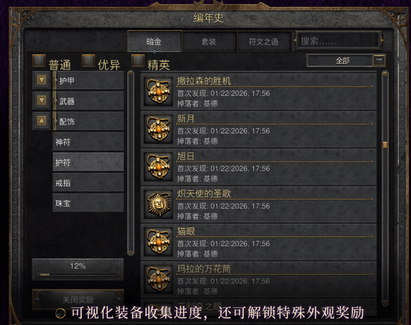 编年史系统融合游戏图鉴和资料库功能。所有装备(暗金、套装等)可在游戏内查询,包括各种符文之语的做法。你打到过的暗金装备会在编年史中记录,还能解锁特殊外观奖励,相当于加入了收藏和成就玩法,终局要做的事更多了。