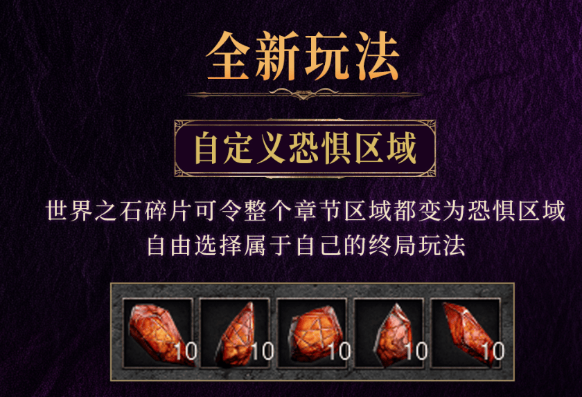 加入新的消耗类道具“世界之石碎片”,玩家可以自主选择恐怖地带地图,对应一个章节,开启之后整章所有区域变为恐怖地带。该道具可交易。