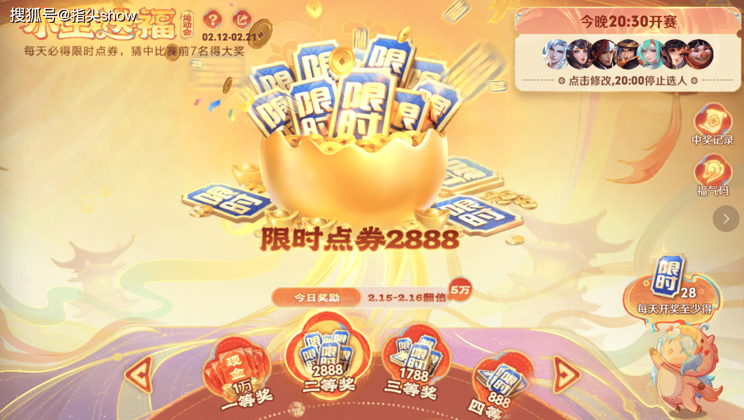 除了有灵宝市集和挖宝外,12日新增了小王送福的奖励,每日竞猜,晚上八点开启抽奖,概率暴击2888点券和一万元大奖,再不济也有限时点券能拿,这是后续白嫖皮肤的关键。