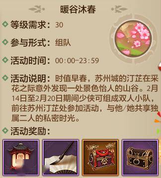 2月14日到2月20日期间,少侠可组成双人小队,前往苏州汀芷处参加活动,舒舒服服泡完温泉,还能收获汀芷精心准备的专属礼包,主打一个情义与福利双丰收!