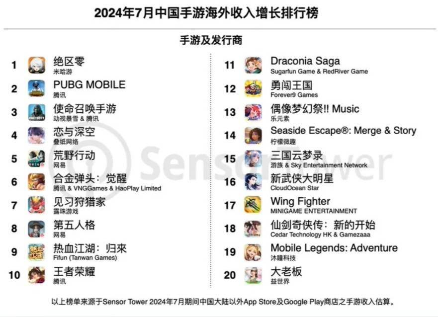 IT之家 8 月 16 日消息,Sensor Tower 数据显示,7 月《绝区零》登顶中国手游海外收入增长榜与下载榜。