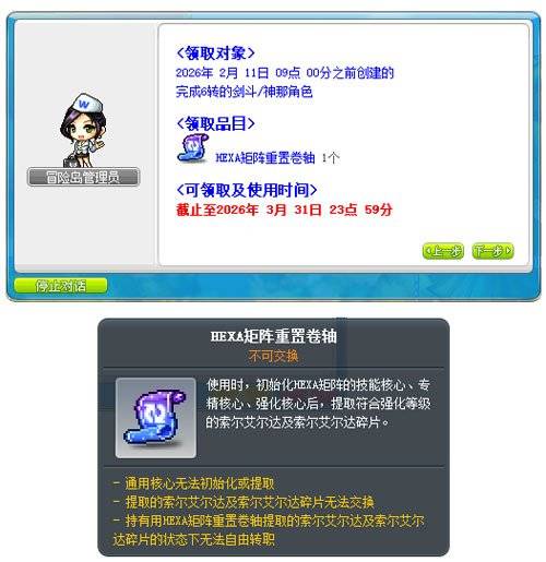 同时,维护前已创建的剑斗/阴阳师,且完成6转的角色,可接取发放[晓之阵]HEXA矩阵重置卷轴任务,获得HEXA矩阵重置卷轴,使用后可初始化HEXA矩阵的技能核心、专精核心、强化核心,提取符合强化等级的索尔艾尔达及索尔艾尔达碎片。