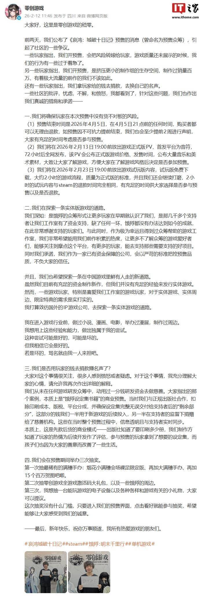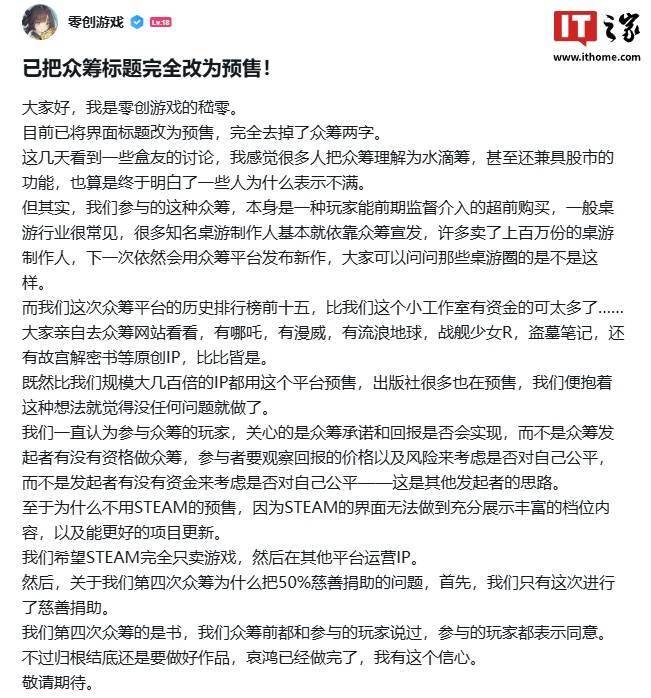 IT之家附零创游戏工作室官方微博回应原文如下: