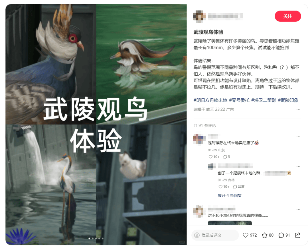 管理员服设宛如尼康娘,拍照系统有16-100m的大变焦,而不同鸟类的惊飞距离也存在差异,因此,你甚至可以在终末地观鸟