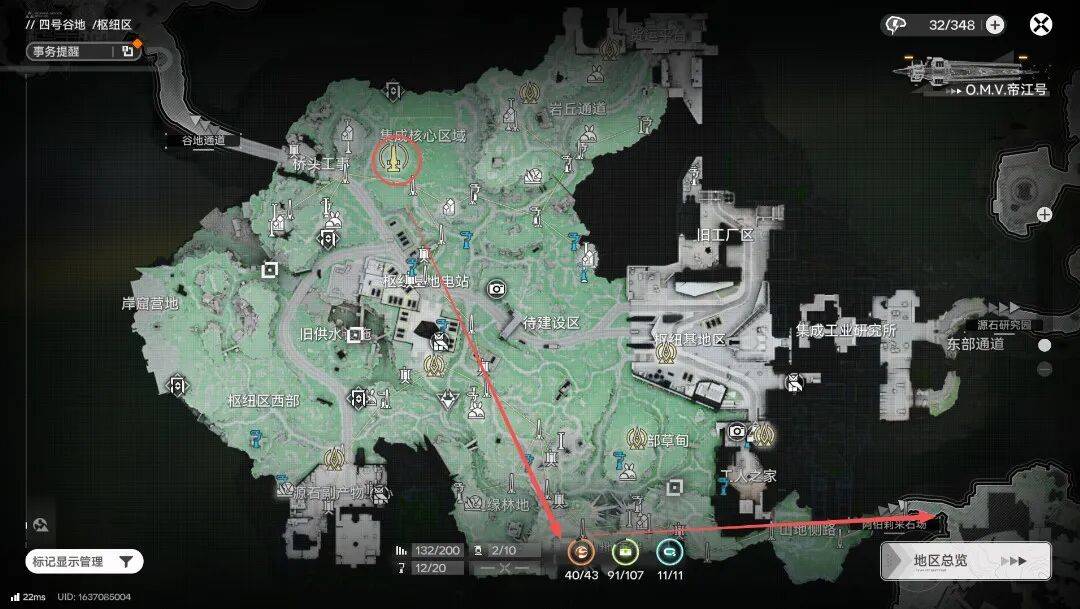 为还没玩过终末地的朋友们简单解释下:如果要开发这两个矿点,一般的最优解就是横穿两个地图,把电从图中的红圈,沿着箭头轨迹,一路拉到蓝圈处。