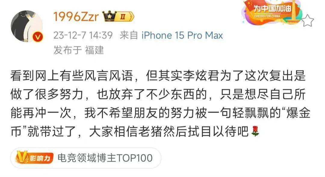对于这种种的质疑声,作为之前的老友Zzr直播时便为其发声,他表示到,Flandre为了这次复出真的做了很多的努力,他也放弃了许多的东西,他只是想尽自己最大力气再冲一次。其实圣枪哥在当年EDG夺冠真的是功不可设,稳也能稳得住,C也能C起来,尽管这次暂别赛场一段时间,但相信他既然选择加入JDG,就肯定是带着状态回归的。